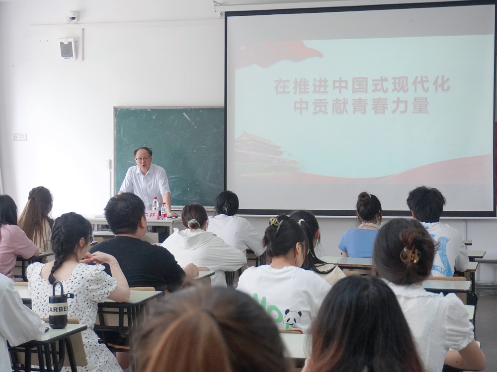 6月15日下午,永利官网党委书记郑群在2教208教室,以“在推进中国式现代化中贡献青春力量”为题,为院学生会、大学生事务中心及自管会等学生组织的主要学生干部、学生党员讲了一堂紧扣主题、生动鲜活的思政课。