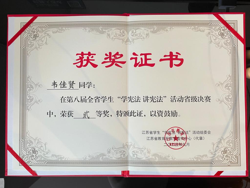 为全面学习贯彻党的二十大精神,深入学习贯彻习近平法治思想,推动青少年宪法宣传教育常态化长效化,9月23—24日,第八届江苏省学生“学宪法 讲宪法”活动省级决赛在南京举行。永利官网语言文化学院秘书2122韦佳贤同学参加高校组演讲比赛,获得省级二等奖。