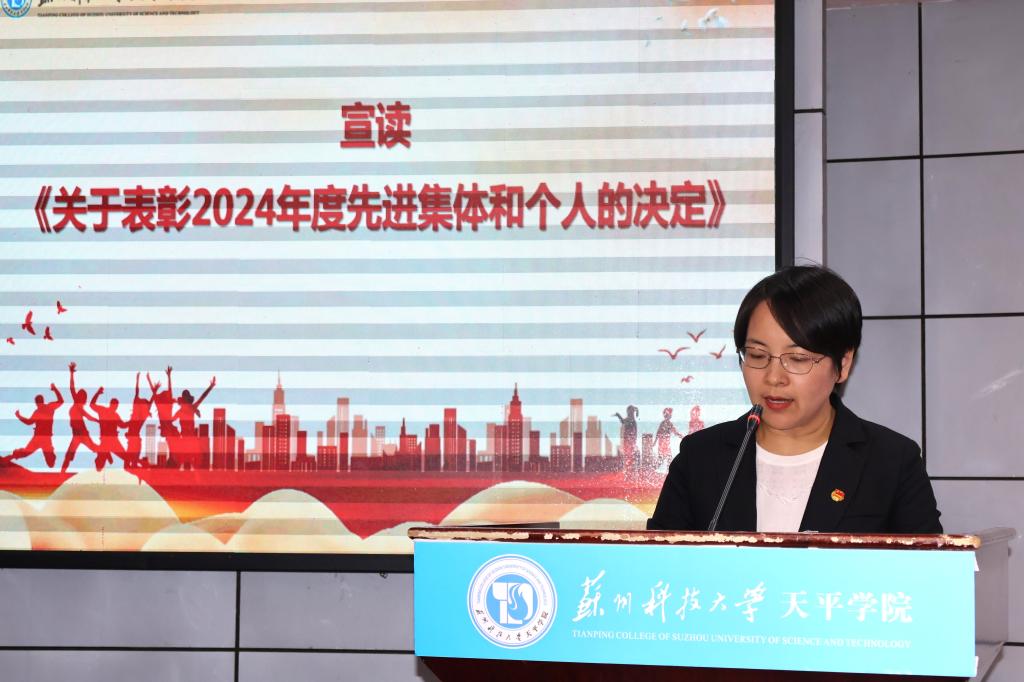 院团委书记刘亚男宣读了《关于表彰2024年度院“五四红旗团总支”“青年五四奖章”等先进集体和优秀个人的决定》。智能制造学院团总支、管理学院团总支荣获2024年度院“五四红旗团总支”称号,商务英语2221团支部等17个团支部荣获2024年度院“五四红旗团支部”称号,孙恒等14名青年荣获2024年度院“青年五四奖章”称号,刘建琦等54名青年荣获2024年度院“优秀共青团干部”称号,蔡菊等94名同学荣获2024年度院“优秀共青团员”称号,英语2323团支部“心若石榴籽,蔓延团结情”等8个项目荣获“优秀主题团日活动”。现场领导为获奖集体和个人代表颁发荣誉证书、奖状。
