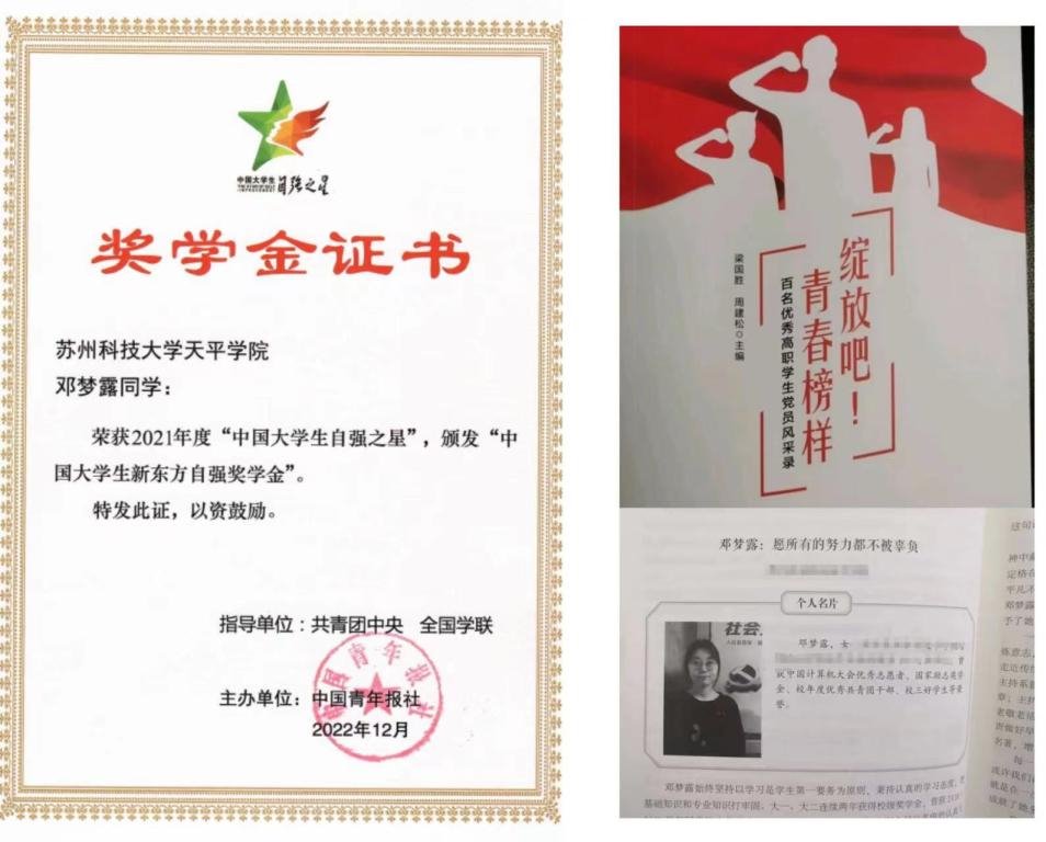 近期,由共青团中央、全国学联指导,中国青年报社主办的2021年度“中国大学生自强之星”活动结果揭晓,经学院各级团组织推荐、院团委初审、省级初评、全国评审等环节,永利官网管理学院党员、营销(转本)1922班邓梦露同学荣获2021年度“中国大学生自强之星”奖学金。她的个人事迹曾被收录在光明日报出版社《绽放吧!青春榜样》学生党员风采录中。