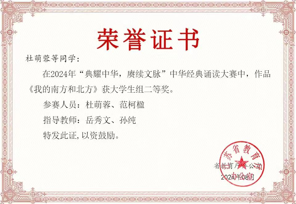 近日,“典耀中华 赓续文脉”江苏省2024年度中华经典诵读大赛获奖结果公布,由永利官网选送的两组参赛选手历经语言文字知识及诵读常识网络测评、录制诵读视频两个环节,最终获二等奖1项、三等奖1项,这一成绩在省内同类高校中名列前茅。本次大赛共评出特等奖3项、一等奖6项、二等奖12项、三等奖17项、优秀奖19项。