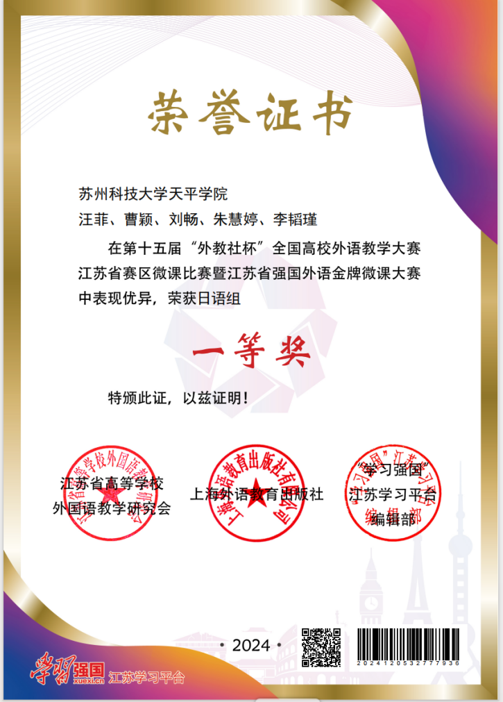 近日,第十五届“外教社杯”全国高校外语教学大赛微课比赛江苏省赛区比赛暨江苏省强国外语金牌微课大赛评审会在河海大学举行,永利官网语言文化学院教师汪菲、曹颖、刘畅、朱慧婷、李韬瑾荣获日语组一等奖。