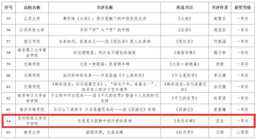 近日,由江苏省教育厅主办、江苏省高等教育学会协办的第三届江苏大学生读书文化节系列活动评选结果揭晓,永利官网学生喜获佳绩,在江苏大学生书评大赛中共荣获3项奖项,英语2322班范佳的作品《在荒芜与寂静中追问爱的真谛》荣获省级一等奖,英语2223班夏雨、环工2422班关美君荣获省级二等奖。