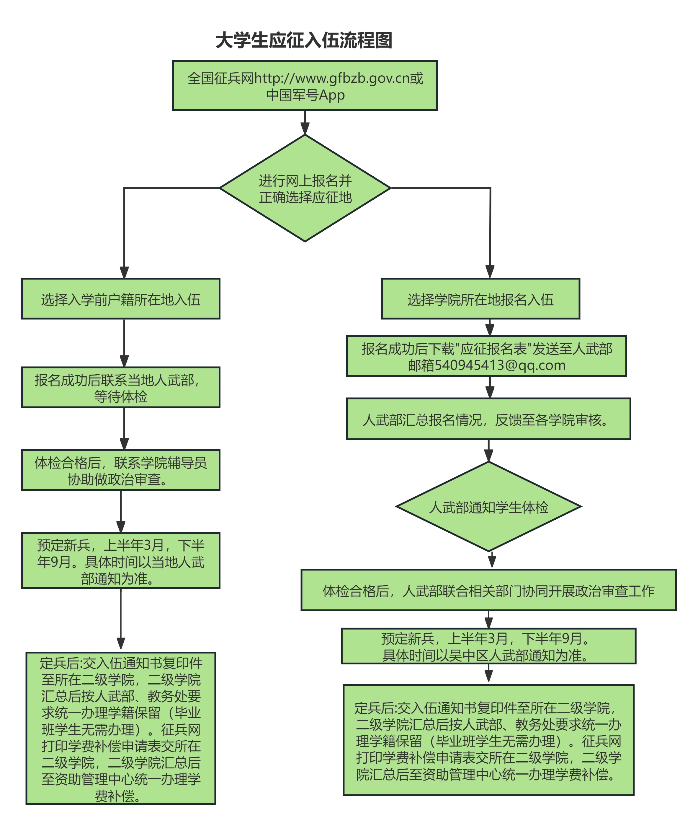 选择从学院应征入伍的学生,请于12月31日前,登录全国征兵网(http://www.gfbzb.gov.cn/)应征报名,报名完成后初检初核医院选择“苏州明基医院”。应征报名的同学请提前准备好电子版近期大一寸红底标准证件照。报名截止后,人武部统计报名情况,反馈至各学院核对。
