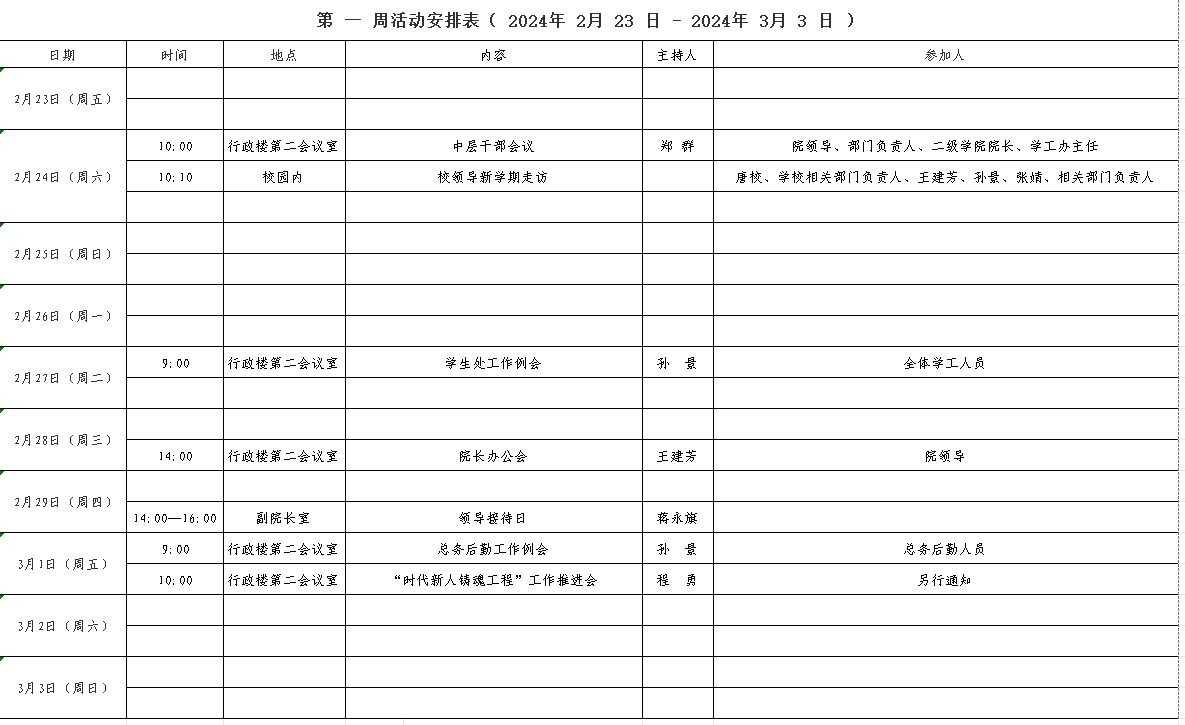 第 一 周活动安排表( 2024年 2 月 23 日 - 2024年 3 月 3 日 )