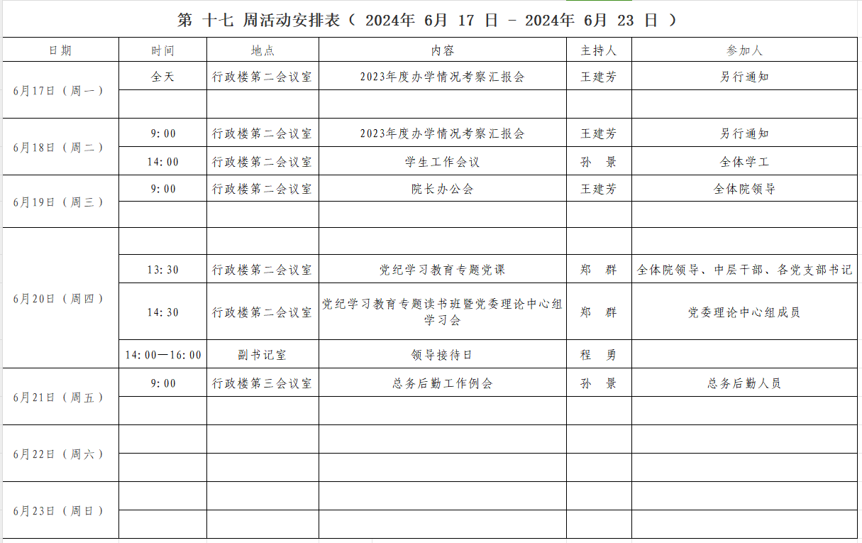 第 十七 周活动安排表( 2024年 6 月 17 日 - 2024年 6 月 23 日 )
