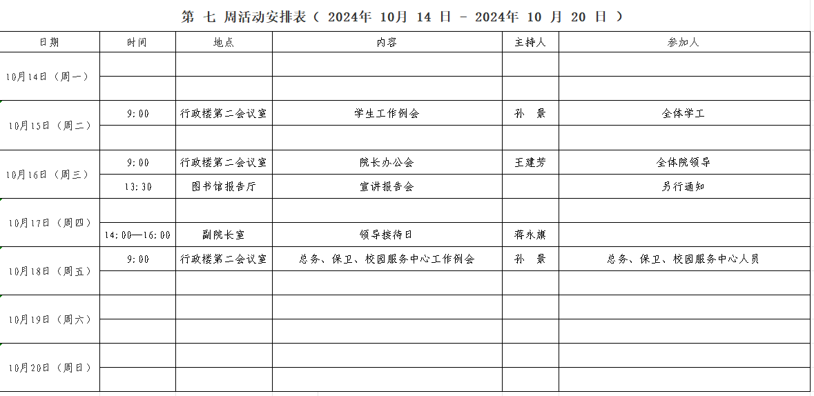 第 七 周活动安排表( 2024年 10 月 14 日 - 2024年 10 月 20 日 )
