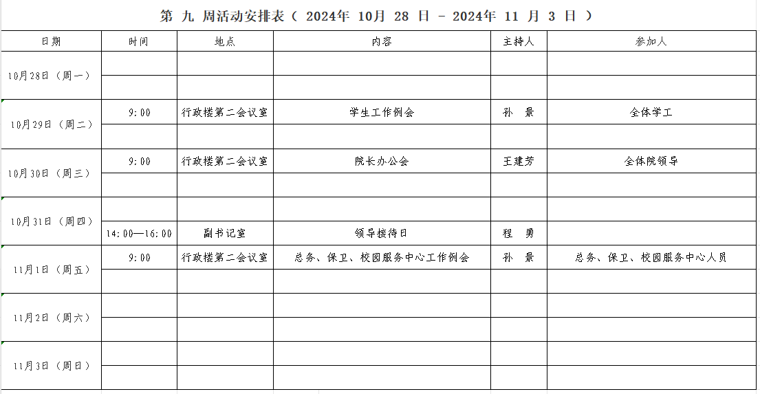 第 九 周活动安排表( 2024年 10 月 28 日 - 2024年 11 月 3 日 )