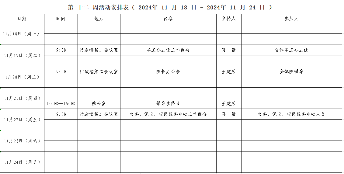 第 十二 周活动安排表( 2024年 11 月 18 日 - 2024年 11 月 24 日 )