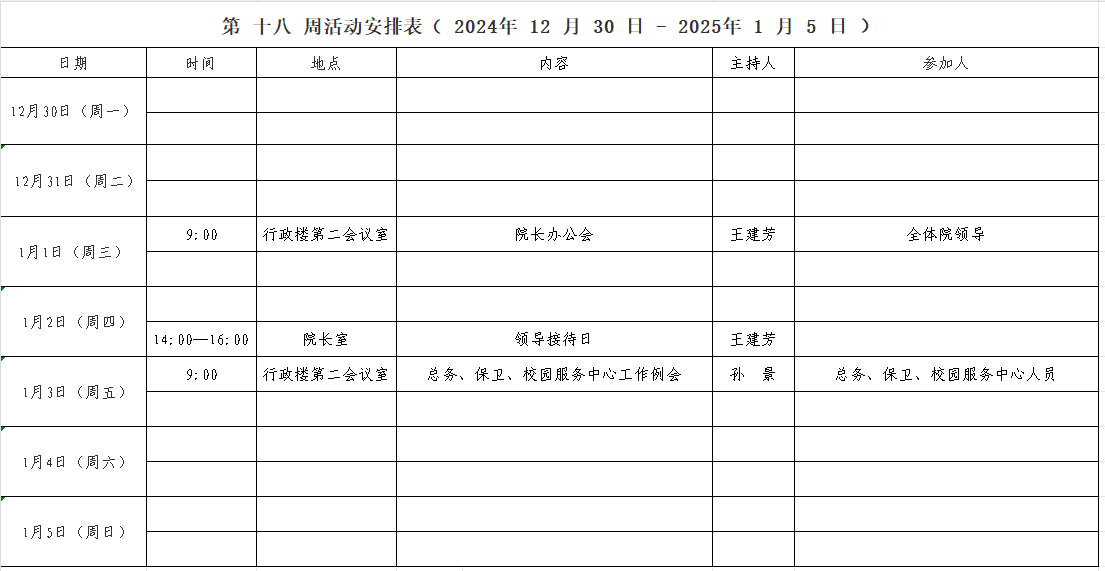 第 十八 周活动安排表( 2024年 12 月 30 日 - 2025年 1 月 5 日 )