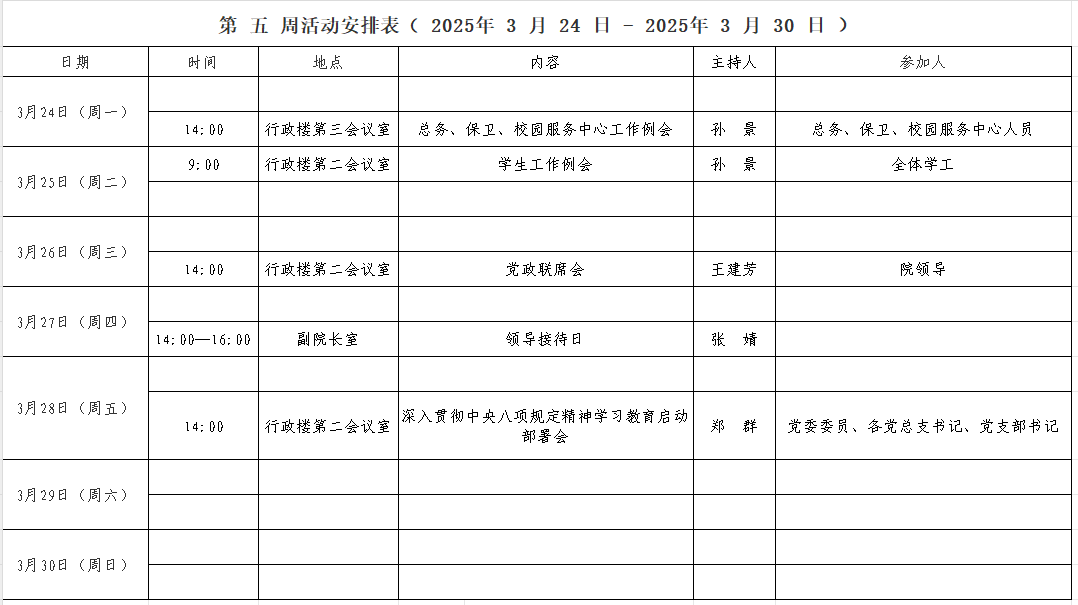 第 五 周活动安排表( 2025年 3 月 24 日 - 2025年 3 月 30 日 )