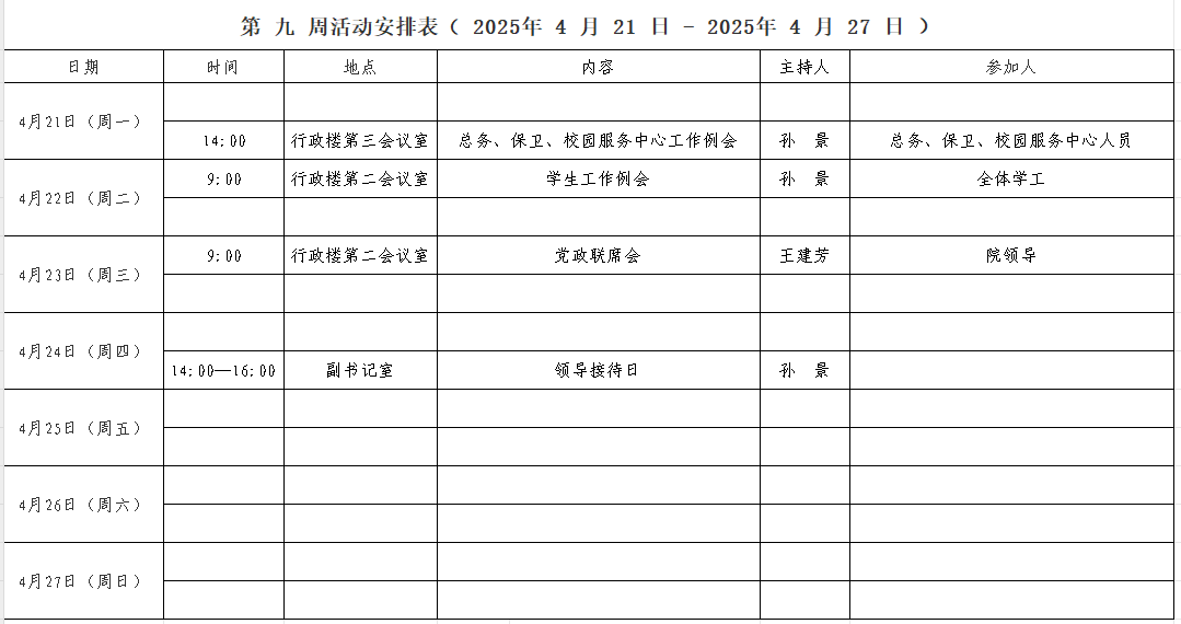 第 九 周活动安排表( 2025年 4 月 21 日 - 2025年 4 月 27 日 )