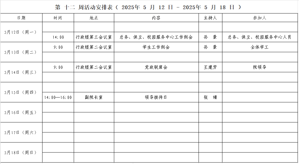 第 十二 周活动安排表( 2025年 5 月 12 日 - 2025年 5 月 18 日 )