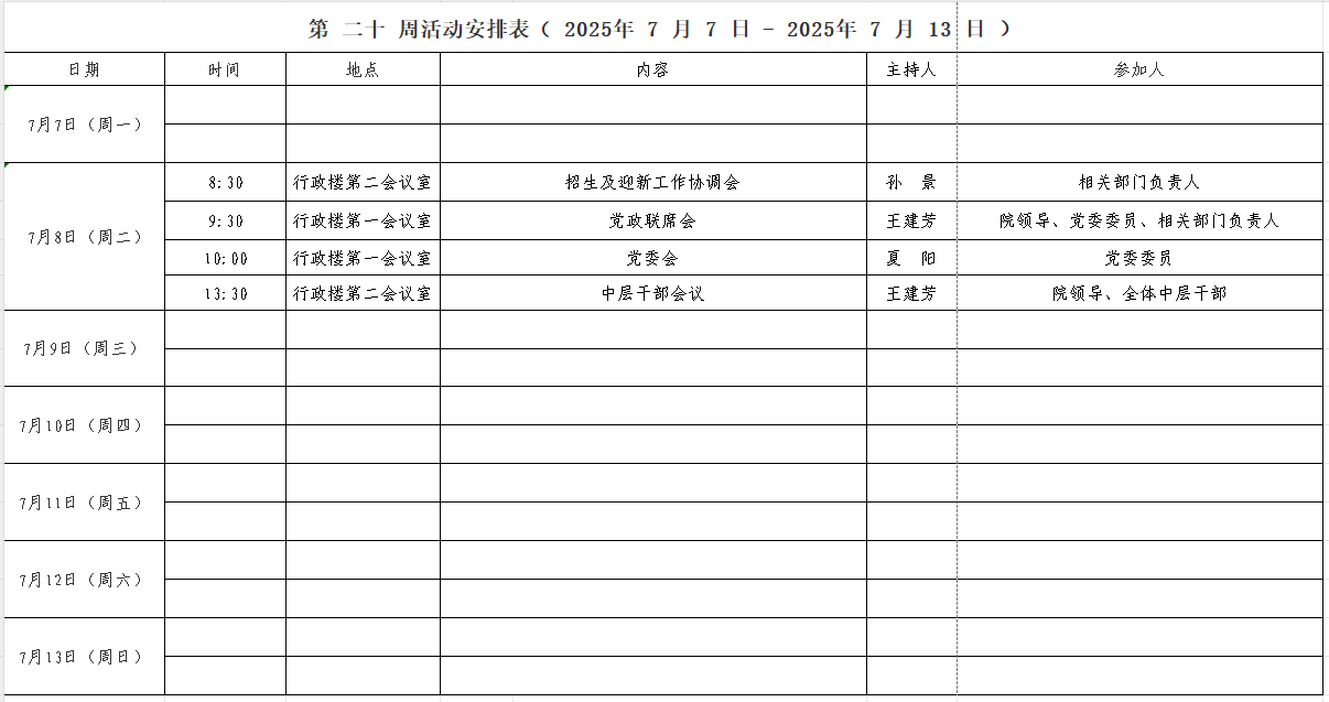 第 二十 周活动安排表( 2025年 7 月 7 日 - 2025年 7 月 13 日 )