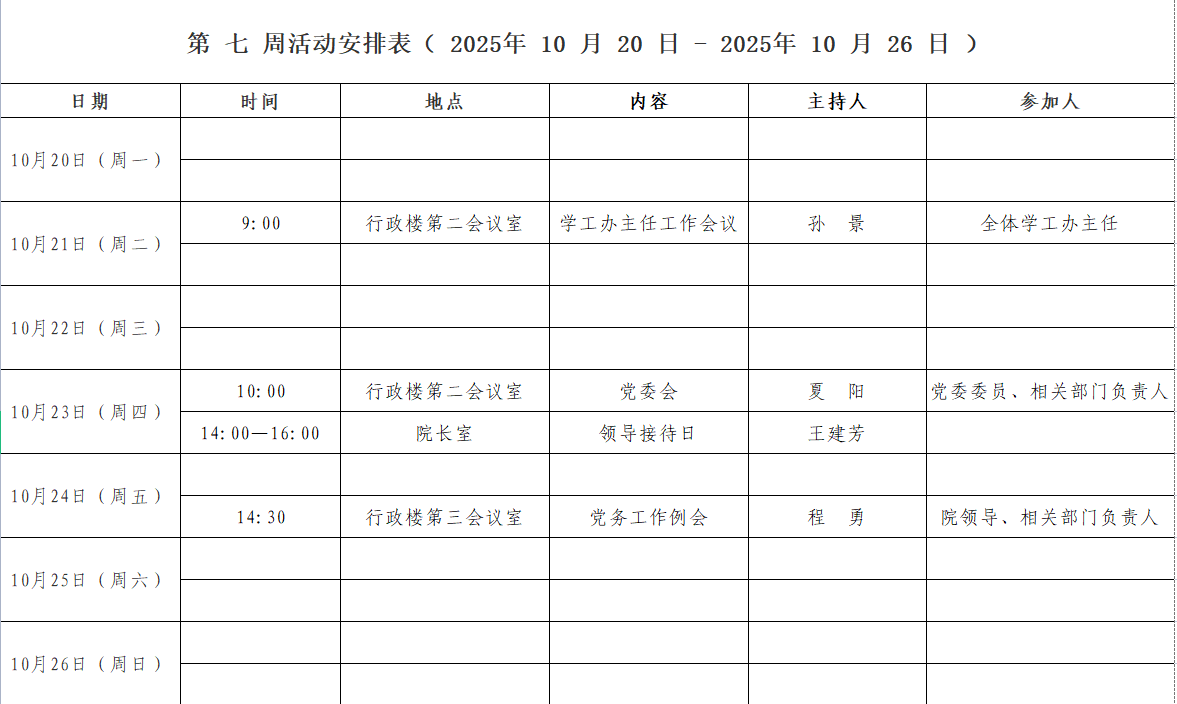 第 七 周活动安排表( 2025年 10 月 20 日 - 2025年 10 月 26 日 )