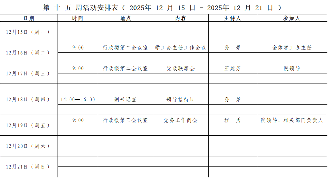 第 十五 周活动安排表( 2025年 12 月 15 日 - 2025年 12 月 21 日 )