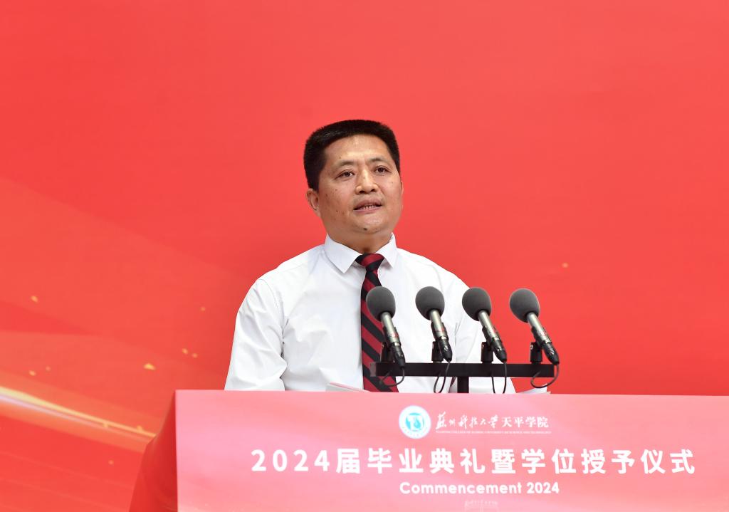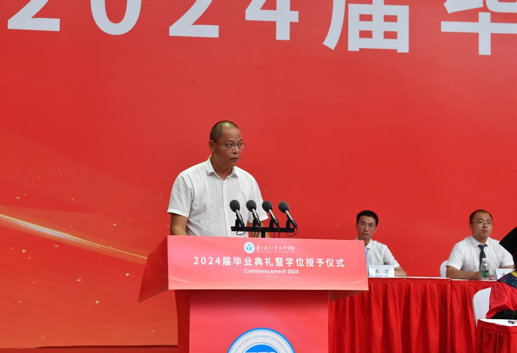 环境科学与工程学院给排水2021班尹艺璇同学代表全体毕业生发言,表示将保持坚韧与执着,不断超越自我,在人生的道路上砥砺前行。教师代表费珺在发言中希望全体毕业生坚持勤劳和勇敢、正直和善良,面向未来,奔腾不止,在各自的领域里承担“社会人”的责任。毕业生家长代表杨伟成先生希望全体毕业生要保持热情、不断学习、努力奋斗,用智慧和勇气书写精彩人生。