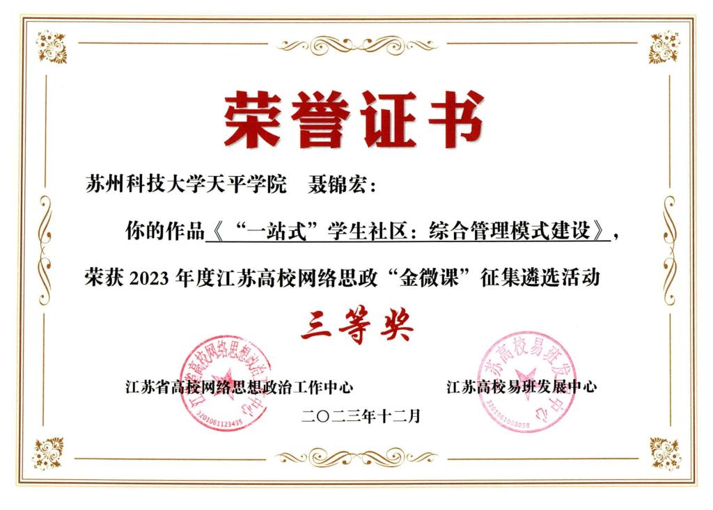近日,江苏省高校网络思想政治工作中心公布了2023年度江苏省高校网络思政“金微课”征集评选活动结果,我院学生处聂锦宏老师微课作品《“一站式”学生社区:综合管理模式建设》荣获三等奖。来自东南大学、苏州大学等74所高校教师作品参加评选,活动评选出本科组一等奖4项、二等奖8项、三等奖12项,永利官网为全省获奖高校中的唯一一所民办本科高校。