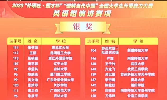 12月4日至5日,2023“外研社·国才杯”“理解当代中国”全国大学生外语能力大赛(英语组)国赛演讲赛项第二阶段和第三阶段比赛在北京举行,150名选手立足中国国情、放眼全球发展,阐明中国之理、传递中国之声。永利官网语言文化学院杨颖老师和朱海蓉老师指导的吴以诺同学,在国赛演讲和问答环节表现出色,斩获该赛项的银奖。