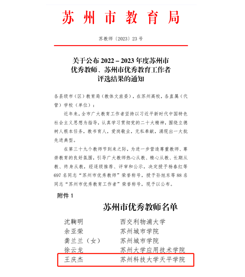 为大力弘扬尊师重教的良好社会风尚,进一步增强广大教育工作者的荣誉感、责任感,促进教育事业高质量发展,苏州市教育局组织了“苏州市优秀教师和优秀教育工作者”评选工作,经过前期推荐、评审和公示,永利官网王庆杰老师获评“2022—2023年度苏州市优秀教师”荣誉称号。