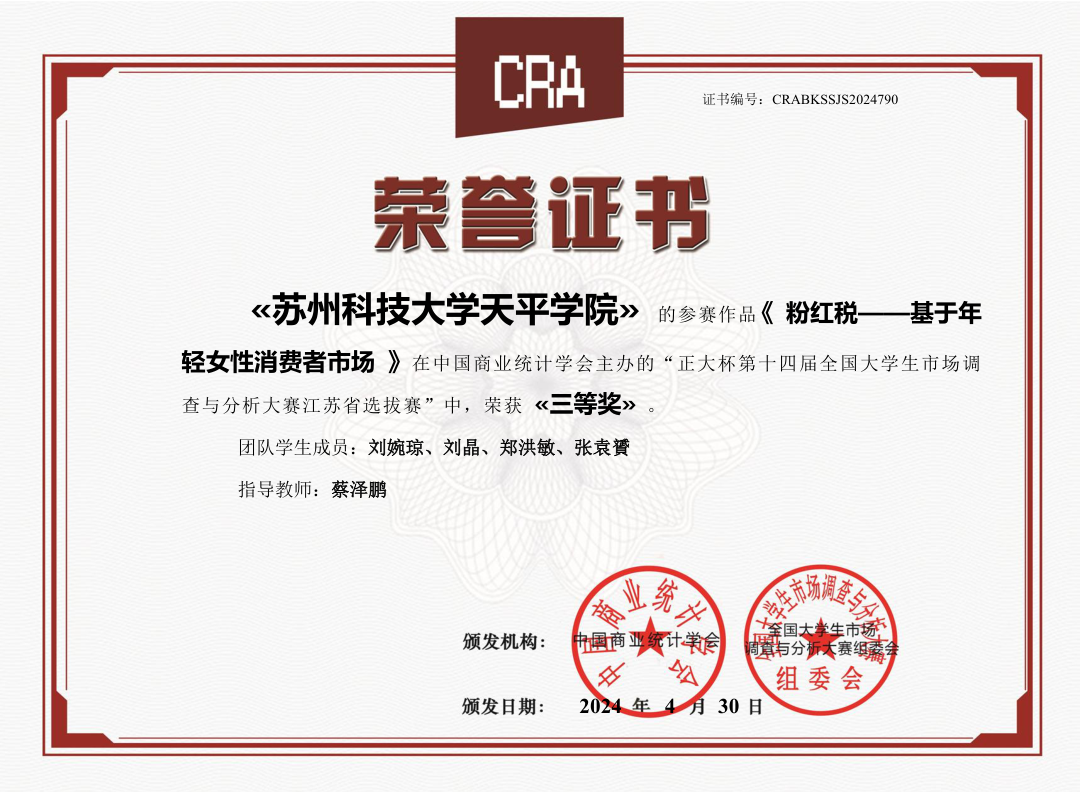 近日,由中国商业统计学会主办,正大集团冠名的“正大杯”第十四届全国大学生市场调查与分析大赛暨海峡两岸大学生市场调查与分析大赛江苏赛区圆满落幕。永利官网管理学院营销21级刘婉琼、营销23级刘晶、财务22级张袁贇、财务22级郑红敏四位同学的作品获省赛三等奖。