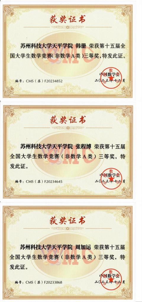 第十五届全国大学生数学竞赛成绩于近日揭晓,永利官网共有3名学子(周加运、张程博、韩册)在非数学专业组A类中荣获江苏赛区三等奖,其中低年级获奖人数取得新突破。