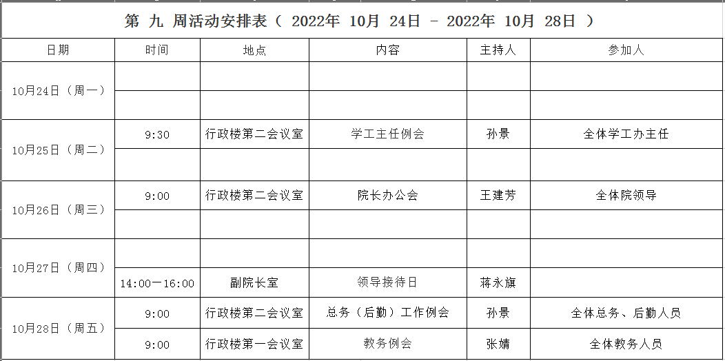 第 九 周活动安排表( 2022年 10月 24日 - 2022年 10月 28日 )