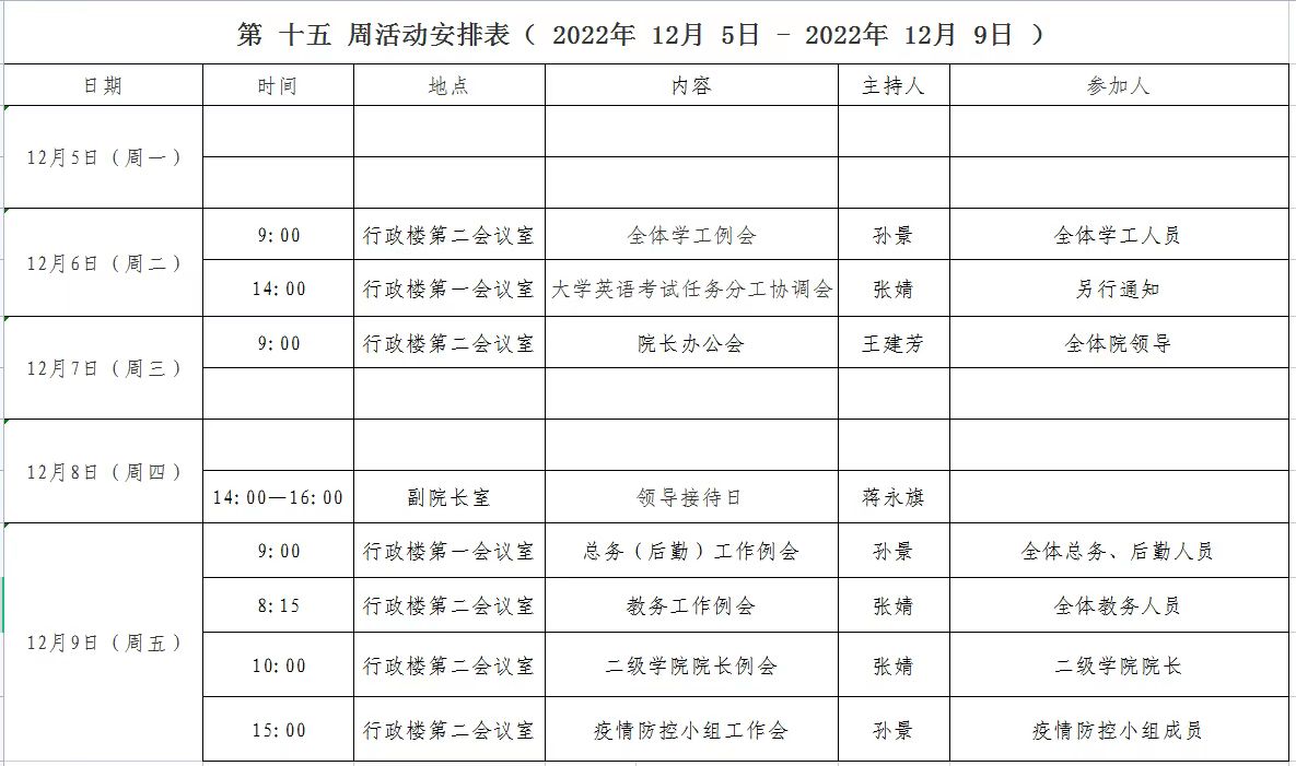 第 十五 周活动安排表( 2022年 12月 12日 - 2022年 12月 16日 )