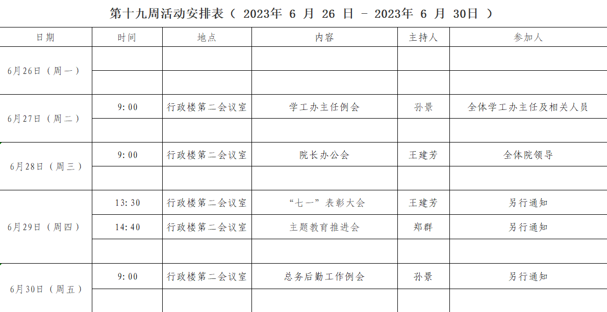 第十九周活动安排表( 2023年 6 月 26 日 - 2023年 6 月 30日 )
