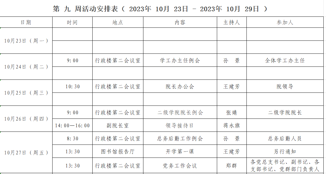 第 九 周活动安排表( 2023年 10月 23日 - 2023年 10月 29日 )