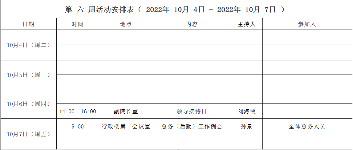 第 六 周活动安排表( 2022年 10月 4日 - 2022年 10月 7日 )