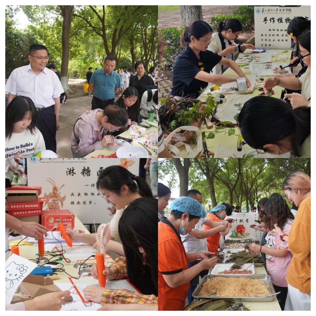本次活动共设有11个富有特色的项目,包括非遗扎染、书法香薰、淋糖画、书法展示、手作植物帆布包制作、非遗漆扇制作、绘纸鸢、包粽子、剪纸艺术、脸谱绘制以及扭扭棒制作等。每一个活动项目都蕴含着深厚的中华文化底蕴和独特的民族风情,师生们以亲身体验书法的行云流水之美、非遗漆扇的漆水相融之韵、糖画的栩栩如生之趣,共同感受中华优秀传统文化的独特魅力。