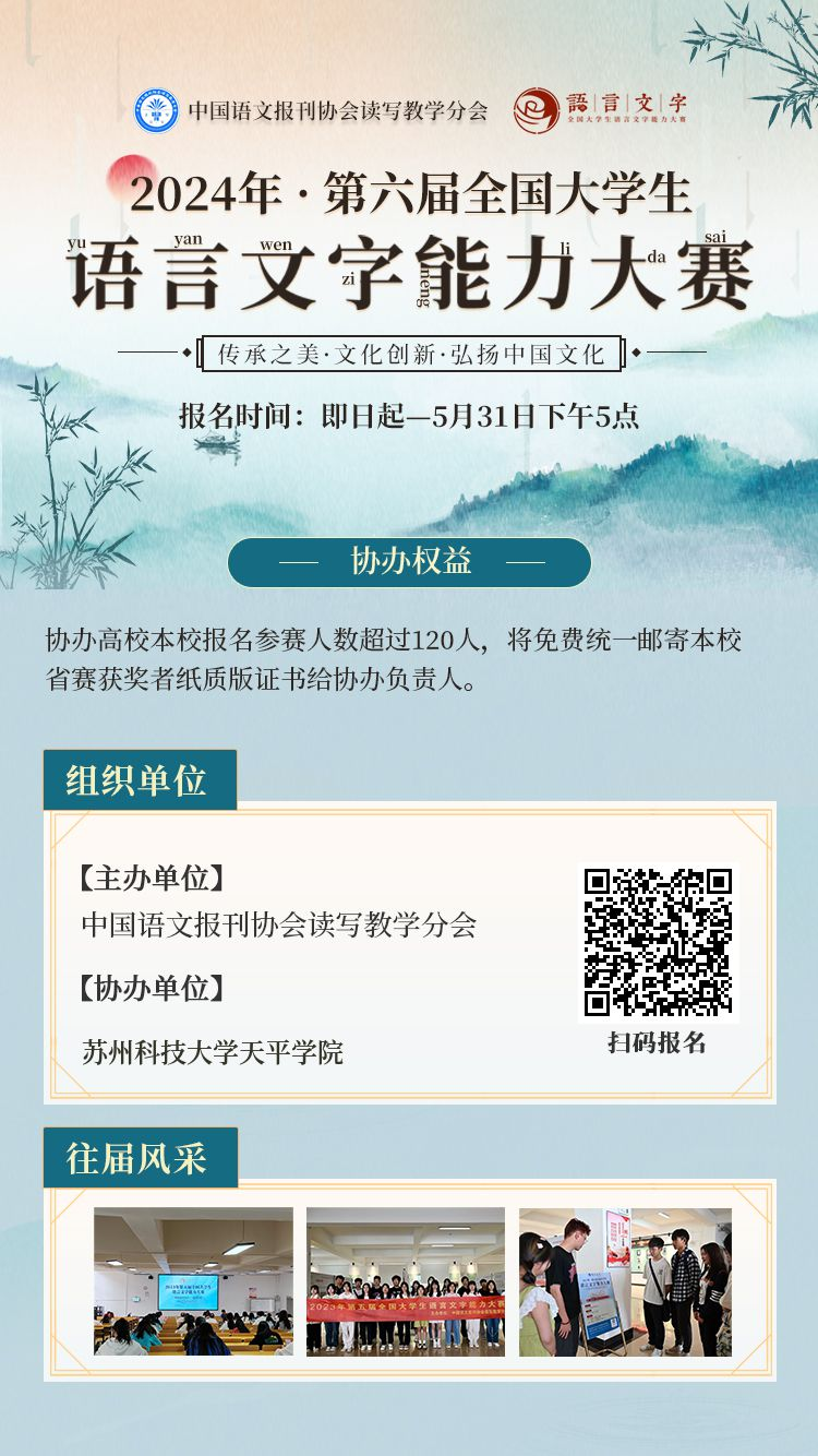 第六届全国大学生语言文字能力大赛由中国语文报刊协会读写教学分会主办,773044永利集团官网已申请成为协办单位。校内选拔、赛前辅导等相关组织工作,由语言文化学院承担。