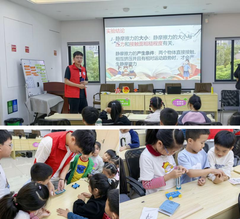 本次志愿服务活动旨在丰富社区儿童的课余生活,普及科学知识。此次志愿活动的课程主题为:滑动摩擦力——揭秘物体运动的隐形推手,对此我们以“理论+互动+实验”三者相结合的方式进行教学,学生们通过参与一系列精心设计的摩擦力实验来深入了解摩擦力的基本概念并联系生活中的摩擦力现象来加深理解。这次实验不仅让学生们直观的感受到了摩擦力,还培养了他们的动手能力和科学探究精神。