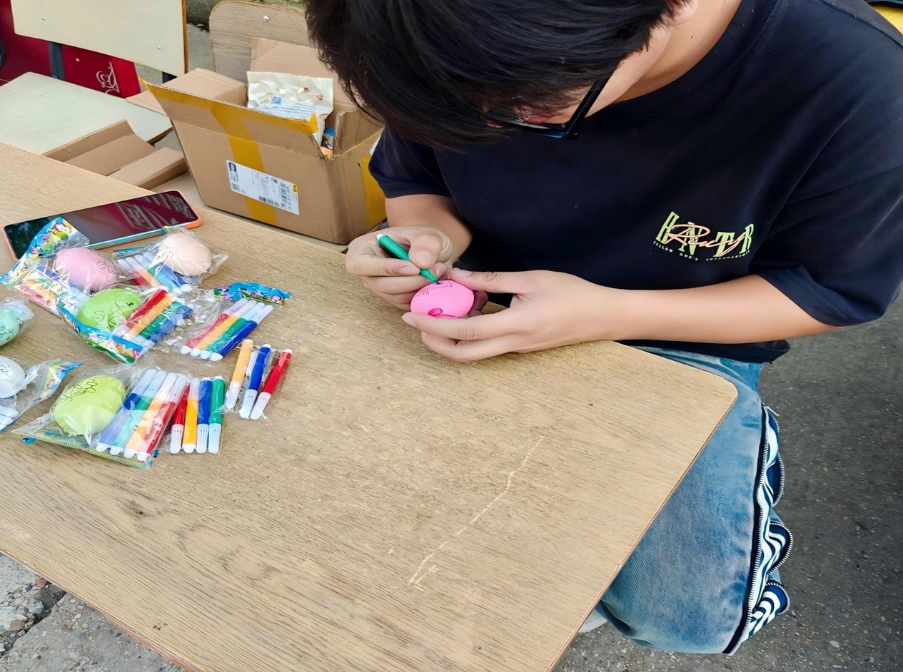 步入手绘彩蛋区域,宛如踏入一个色彩斑斓的梦幻世界。工作人员精心筹备了各式各样颜色与图案的彩蛋,旁边整齐有序地摆放着丰富多样的绘画工具和颜料。参与者们满怀期待,纷纷领取鸡蛋、颜料和工具,急切地开启属于自己的手绘创作之旅。工作人员热情地鼓励大家大胆放飞想象,尽情运用各种色彩和图案来装饰彩蛋。一时间,创意的火花在这里四处迸射。在专注的创作过程中,时间悄然流逝,不一会儿,一个个色彩绚丽、创意十足的彩蛋便展现在众人眼前。这些彩蛋犹如璀璨的宝石,闪耀着参与者们的创意光芒,承载着大家对祖国的美好祝福。