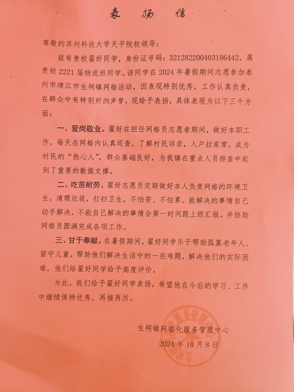近日,管理学院收到了一封来自泰州市靖江市生祠镇网格化服务管理中心的表扬信,信中高度赞扬了永利官网学生翟好暑假社会实践期间在服务基层、关爱空巢老人方面的杰出表现。这一荣誉不仅是对翟好个人品质的肯定,更是对我们管理学院学子社会责任感和奉献精神的生动诠释。