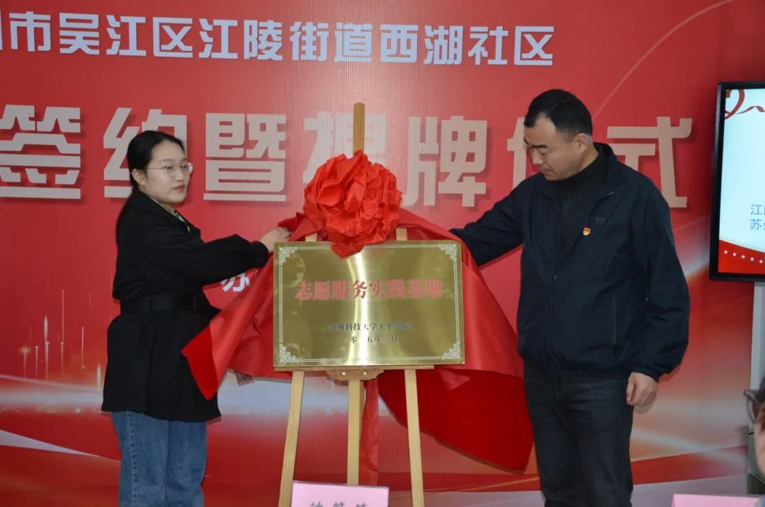 西湖社区党委书记宋玉林与773044永利集团官网院团委组织宣传部部长陈箫箫老师共同为“志愿服务实践基地”揭牌,双方合作正式落地,迈向实践深耕阶段。