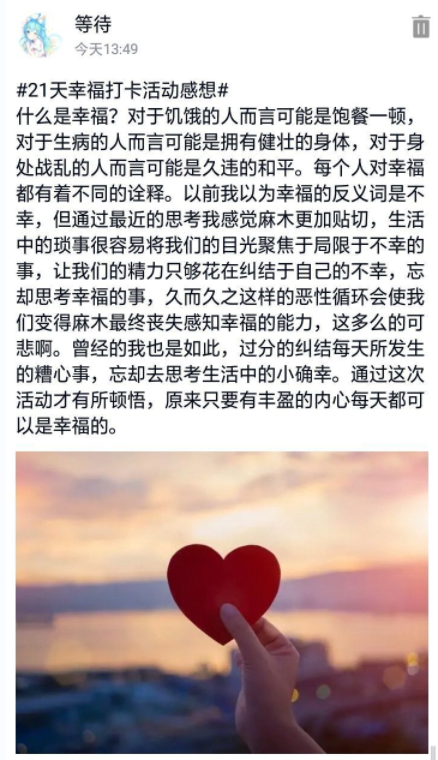 汉语z1923徐欣说:“渐渐不是在为打卡而打卡,开始享受自己完成学习任务时打勾的幸福和快乐。开始发现生活中的小美好,开始关注大自然,有平稳的生活节奏,不会盲目地活着,有着清晰的目标,感谢21天幸福打卡活动,希望自己可以一直幸福下去。”