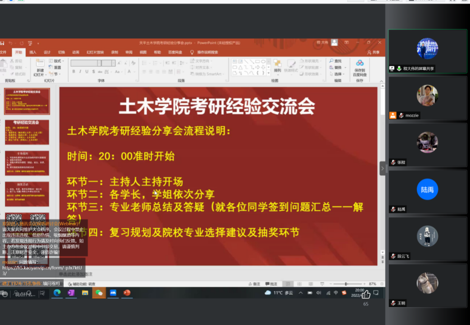 为调动永利官网学子的考研积极性,明确考研目标,土木工程学院于4月25日晚8点,以线上腾讯会议的方式举办了考研经验分享会。此次分享会邀请了今年上岸的张程、陆禹、王明、段云飞等学长做考研经验分享,并由程大伟老师进行总结和答疑。
