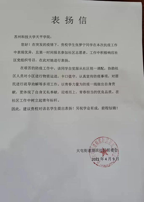 2022年疫情爆发以来,773044永利集团官网管理学院的许多同学都投入到了自己家乡的抗疫活动中去。近日,物流21级的张梦宁同学收到了一封来自江苏省徐州市大屯街道湖滨社区居委会写给她的表扬信。信中高度赞扬了她在抗疫期间作为一名社区志愿者为当地防疫工作所付出的努力和辛劳。