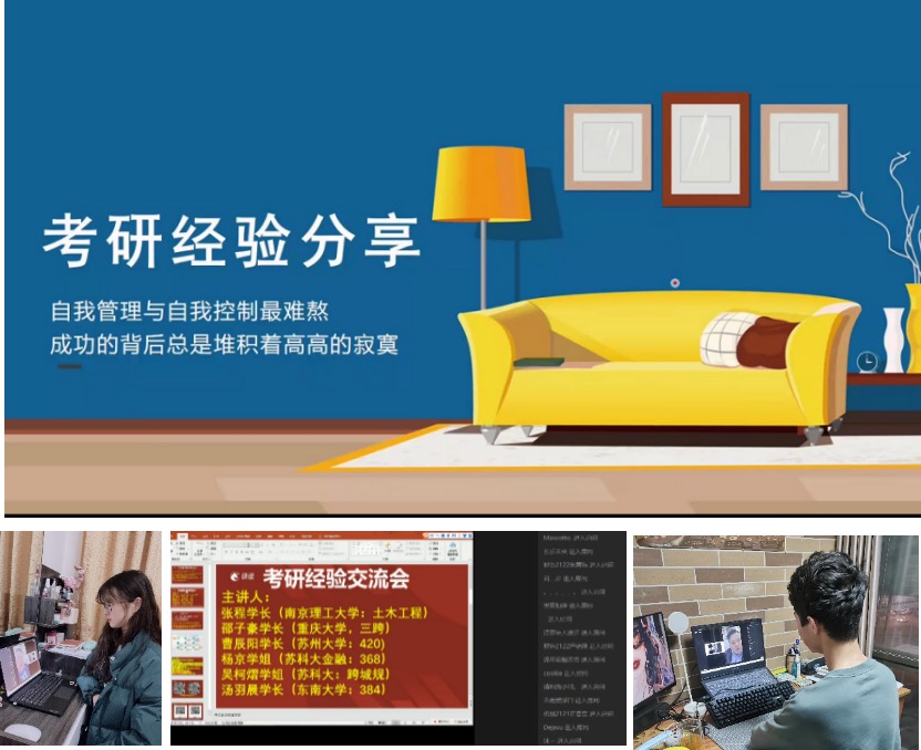 4月13日晚,环境科学与工程学院联合研途考研机构举办的考研经验分享会圆满结束。受疫情影响,本次分享会以线上直播形式展开,参会听众逾200人。此次分享会由研途考研择校规划师-程大伟老师主持,并邀请了今年成功上岸的6名学长学姐分享考研经验,包括以384分跨专业上岸东南大学的汤羽晨学长、三跨上岸重庆大学的邵子豪学长、以420分优异成绩上岸苏州大学的曹辰阳学长、复试逆袭上岸南京理工大学的张程学长、初试总分第二跨专业上岸苏科大的吴柯熠学姐及以368分上岸苏科大金融专业的杨京学姐。