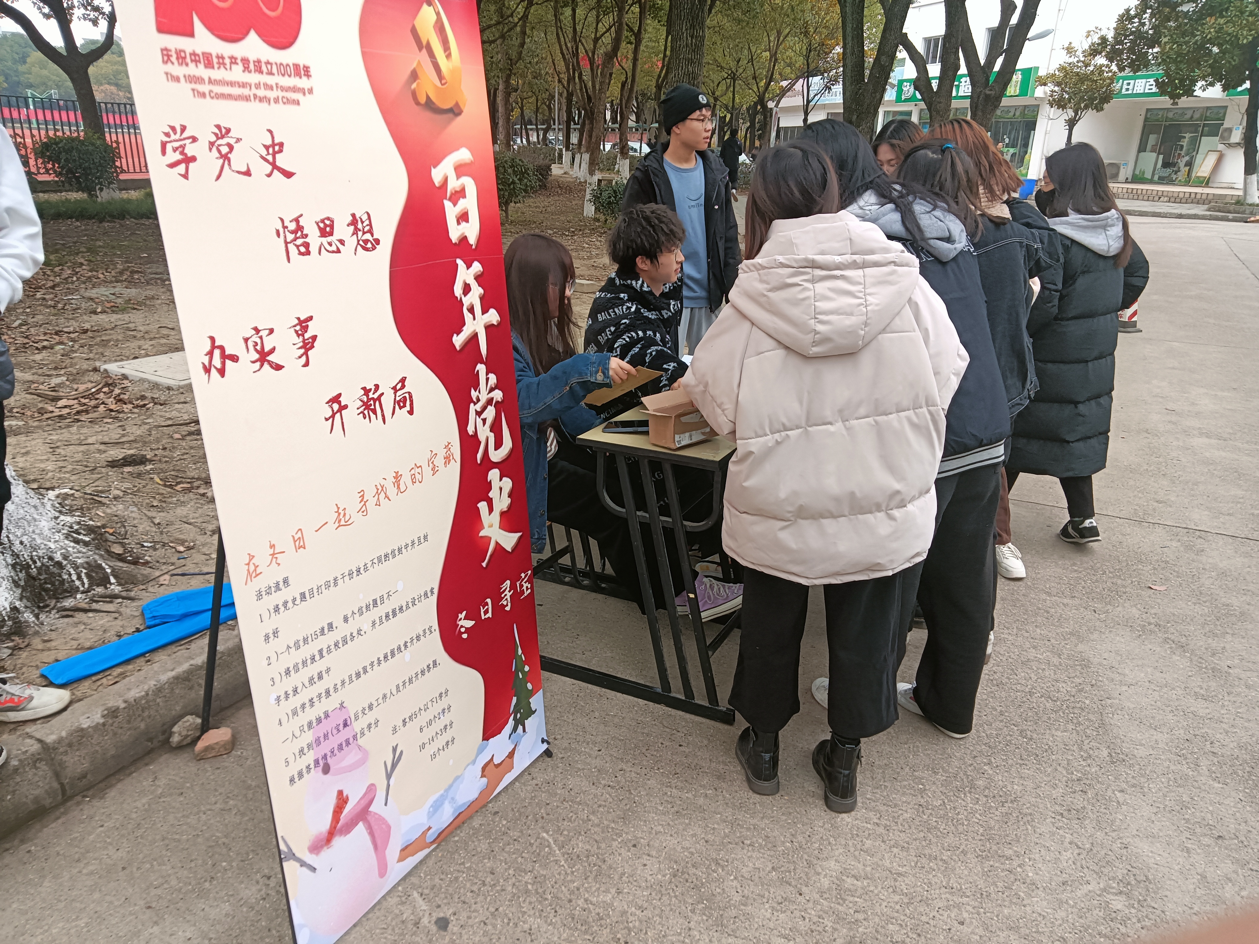 2021年是建党100周年、“十四五”规划的开局之年。土木工程学院以打造“知史、爱党”为目标,开展“学党史、悟思想、办实事、开新局”建党100周年党史学习教育系列活动,进一步构建爱国爱党的良好氛围,在2021年12月14日举办党史冬日寻宝活动。