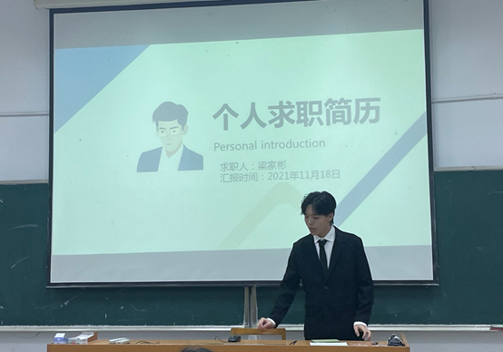 比赛开始前,通过简历筛选,最后共有七人进入本次初赛。此次比赛由相关老师和四名19级和20级的同学作为评委。活动伊始,主持人对本次比赛的规则和目的做了一个简单的介绍,七人按照顺序轮流上台进行自我介绍。其中,18级的付翔同学作为第一个上场的选手,丝毫没有慌乱,从容地讲着自己大学四年的经历,这份沉着冷静获得了台下评委的一致好评。比赛结束后,吴韦晶老师对参与本次活动的选手进行了点评,指出了他们准备的材料的不足之处,鼓励他们完善自己的资料,以便能够在真正的校招中取得成功。