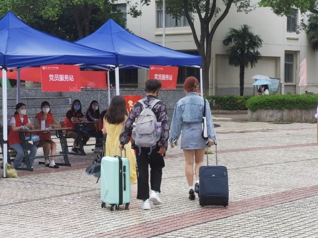由于疫情防控需要,新生有序地通过体温监测与信息查验。顺利进校后,志愿者们带领他们前往图书馆广场报到,引导他们领取一卡通、入宿单等。