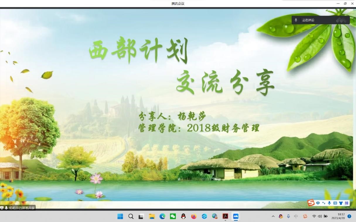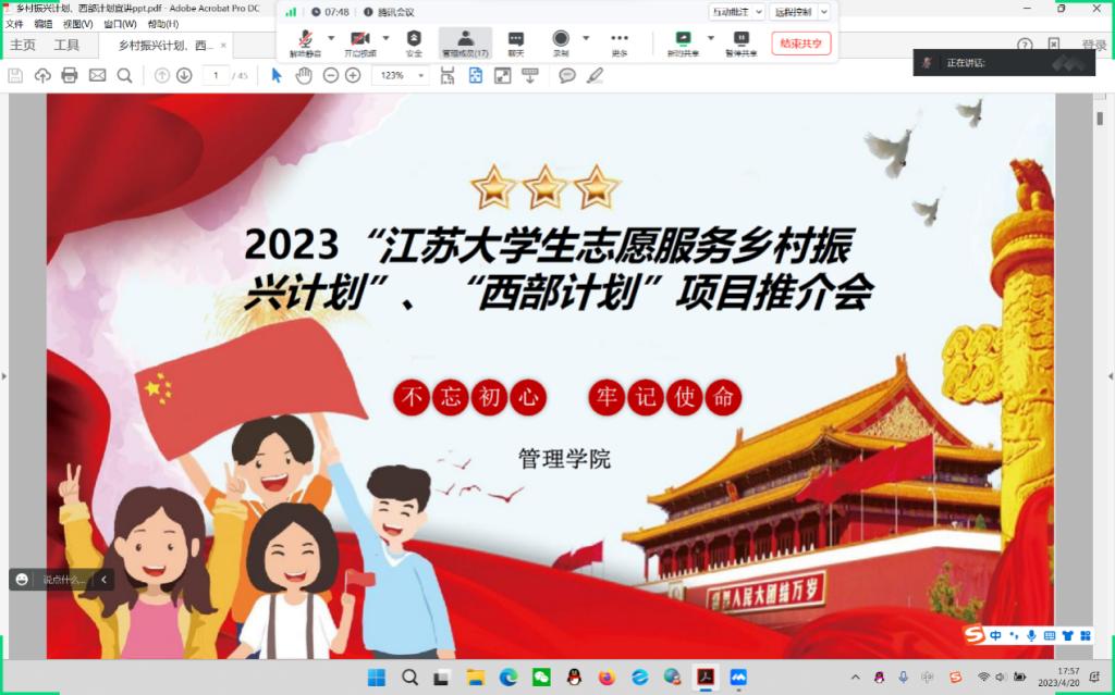 为进一步宣传乡村振兴计划、西部计划,更深层次动员永利官网青年大学生扎根基层、扎根西部,引导学生躬亲实践,管理学院团总支于4月20日晚召开了2023年“西部计划”、“志愿服务乡村振兴计划”线上宣讲会。