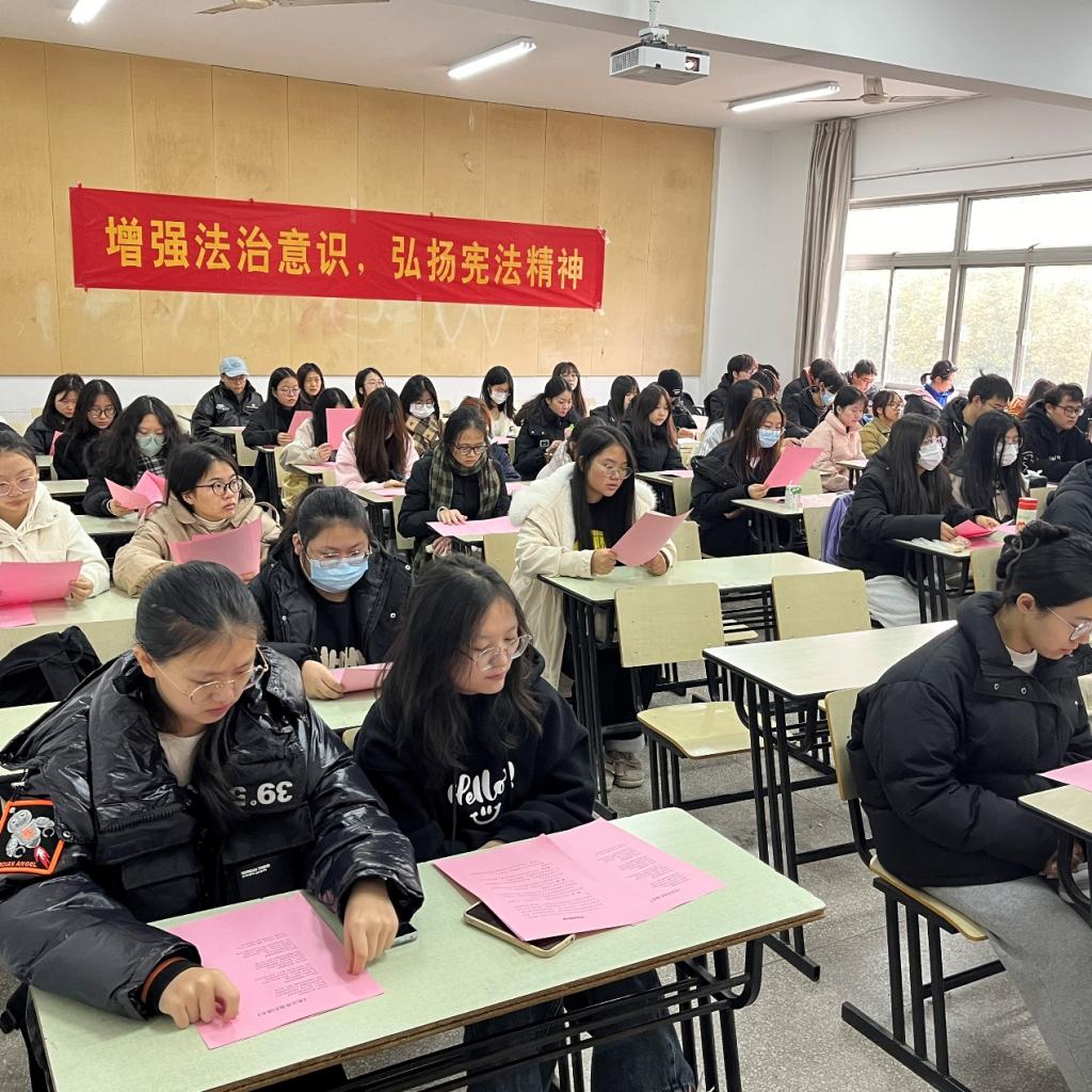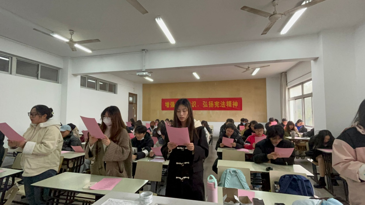 宪法是国家根本法,是治国安邦的总章程,是党和人民意志的集中体现。党的二十大报告提出,要完善以宪法为核心的中国特色社会主义法律体系,强调要加强宪法实施和监督,健全保证宪法全面实施的制度体系,更好发挥宪法在治国理政中的重要作用,维护宪法权威。2023年12月4日是第十个国家宪法日,为增强永利官网师生守宪法的意识,帮助同学们了解宪法的重要性与意义,营造青年关注法治、学习法律的氛围,773044永利集团官网语言文化学院开展了宪法晨读活动。
