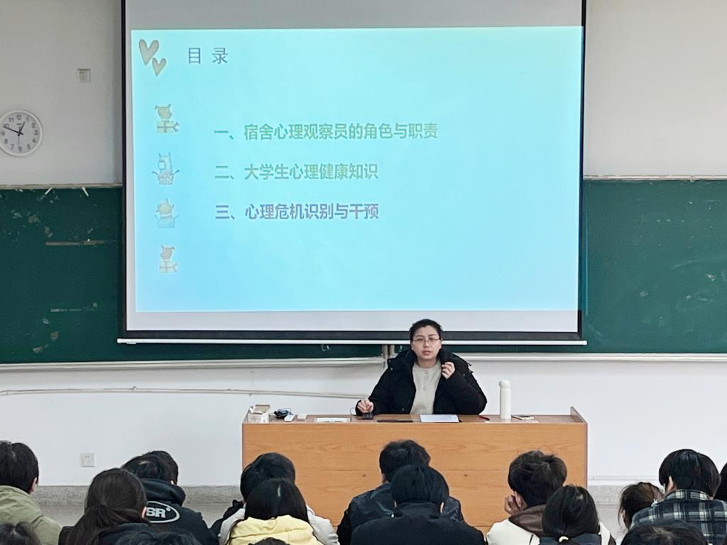 本次培训会围绕宿舍心理观察员的角色定位、职责与素质要求,大学生心理健康知识,心理危机识别与干预三个方面进行详细介绍。季老师在培训会上尤其强调:心理观察员在工作中要注意保密原则,平时多关心关注同学,发现危机信号要及时汇报给辅导员。