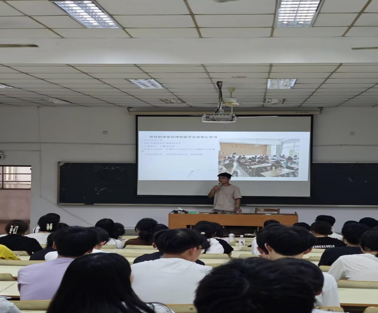 12名优秀的学生对新生分享了自己进校以来取得成果和学习方法。新同学们带着好奇与憧憬提前就座,眼中闪烁着对大学生活的期待。见面会开场,环境科学与工程学院团总支副书记刘志俊以富有感染力的话语介绍了本次交流会的重要意义和流程,对新同学的加入表示热烈欢迎,并强调了新老生交流传承的重要性。环境科学与工程学院团学组织代表王光裕首先发言,分享自己的学习经验。随后,多名优秀代表分享了自己的学习心得和成长故事。介绍了学校的各类学生组织和社团,鼓励新同学积极参与,拓展自己的兴趣爱好和社交圈子。有的讲述了自己在学术上的奋斗历程,如何从迷茫到找到学习的方向,鼓励新同学要勇于探索、积极进取;有的分享了自己在社团活动中的精彩故事,展示了丰富多彩的校园生活,提醒新同学要合理安排时间,全面发展自己;还有的讲述了自己在实践中的收获与成长,让新生们明白实践出真知的道理,他们也有的以优异的成绩获得各类奖学金,有的在学科竞赛中屡获佳绩。他们的经历激励着新同学们努力拼搏,追求卓越。